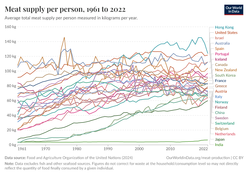 “Data Page: Yearly per capita supply of all meat”. Our World in Data (2025). Data adapted from Food and Agriculture Organization of the United Nations. Retrieved from https://archive.ourworldindata.org/20251017-145813/grapher/meat-supply-per-person.html [online resource] (archived on October 17, 2025).How to cite this data