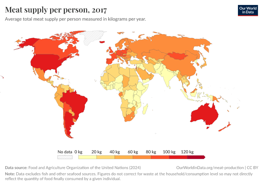“Data Page: Yearly per capita supply of all meat”. Our World in Data (2025). Data adapted from Food and Agriculture Organization of the United Nations. Retrieved from https://archive.ourworldindata.org/20251128-120039/grapher/meat-supply-per-person.html [online resource] (archived on November 28, 2025).