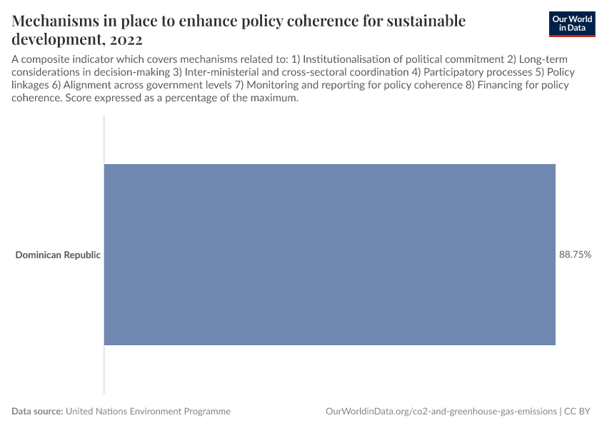 United Nations Environment Programme – processed by Our World in Data. “Mechanisms in place to enhance policy coherence for sustainable development” [dataset]. United Nations Environment Programme, “Data from multiple sources” [original data]. Retrieved December 17, 2025 from https://archive.ourworldindata.org/20251120-211749/grapher/mechanisms-to-enhance-policy-for-sustainable-development.html (archived on November 20, 2025).