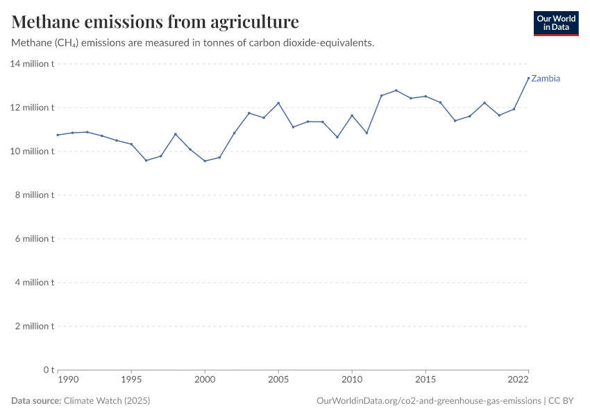Climate Watch (2025) – with major processing by Our World in Data. “Methane emissions from agriculture” [dataset]. Climate Watch, “Greenhouse gas emissions by sector” [original data]. Retrieved December 6, 2025 from https://archive.ourworldindata.org/20250923-123419/grapher/methane-emissions-agriculture.html (archived on September 23, 2025).