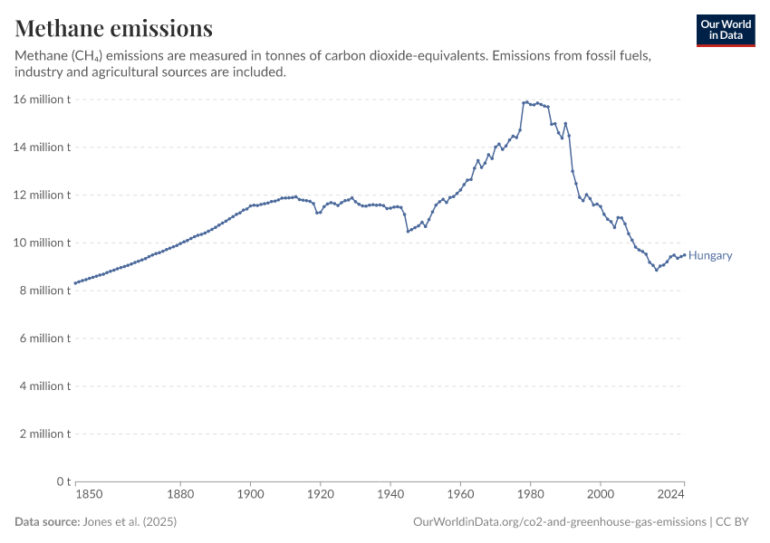 Jones et al. (2025) – with major processing by Our World in Data. “Annual methane emissions including land use” [dataset]. Jones et al., “National contributions to climate change 2025.1” [original data]. Retrieved December 27, 2025 from https://archive.ourworldindata.org/20251204-133820/grapher/methane-emissions.html (archived on December 4, 2025).