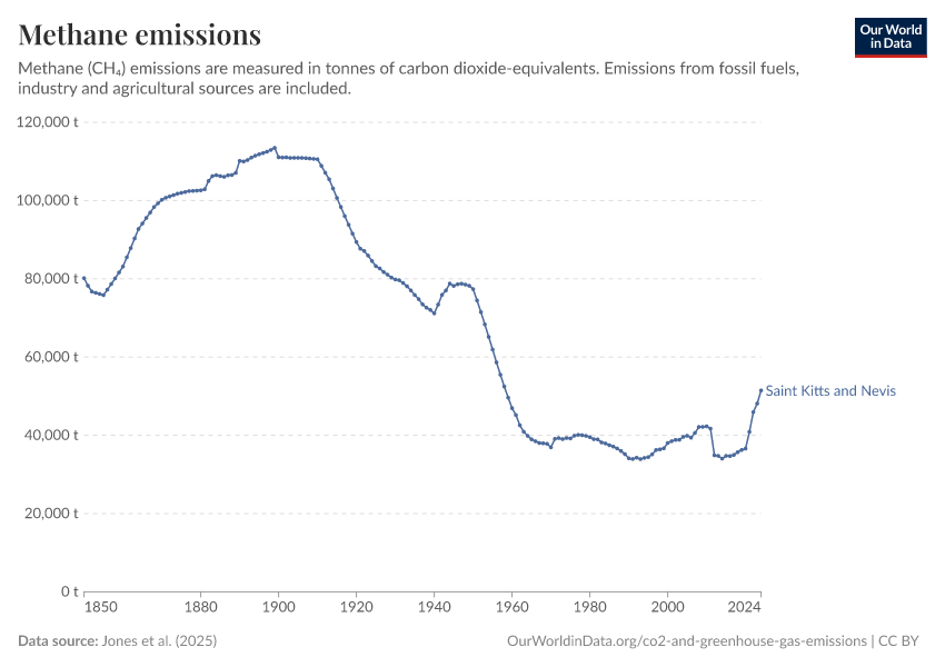 Jones et al. (2025) – with major processing by Our World in Data. “Annual methane emissions including land use” [dataset]. Jones et al., “National contributions to climate change 2025.1” [original data]. Retrieved December 5, 2025 from https://archive.ourworldindata.org/20251204-133820/grapher/methane-emissions.html (archived on December 4, 2025).
