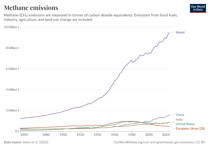 Jones et al. (2025) – with major processing by Our World in Data. “Annual methane emissions including land use” [dataset]. Jones et al., “National contributions to climate change 2025.1” [original data]. Retrieved February 16, 2026 from https://archive.ourworldindata.org/20260119-070102/grapher/methane-emissions.html (archived on January 19, 2026).