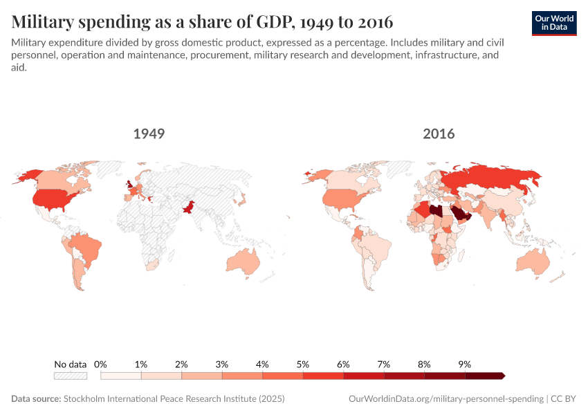 “Data Page: Military spending as a share of GDP”, part of the following publication: Bastian Herre and Pablo Arriagada (2013) - “Military Personnel and Spending”. Data adapted from Stockholm International Peace Research Institute. Retrieved from https://archive.ourworldindata.org/20251209-133038/grapher/military-spending-as-a-share-of-gdp-sipri.html [online resource] (archived on December 9, 2025).How to cite this data