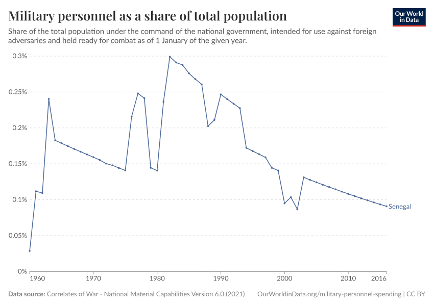 Correlates of War - National Material Capabilities Version 6.0 (2021) – with major processing by Our World in Data. “Military personnel as a share of total population” [dataset]. Correlates of War, “National Material Capabilities Version 6.0” [original data]. Retrieved November 19, 2025 from https://archive.ourworldindata.org/20250909-093708/grapher/military-personnel-as-a-share-of-total-population.html (archived on September 9, 2025).