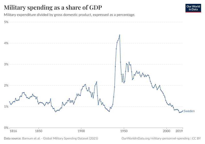 Barnum et al. - Global Military Spending Dataset (2025) – with minor processing by Our World in Data. “Military spending as a share of GDP” [dataset]. Barnum et al., “Global Military Spending Dataset Version 8” [original data]. Retrieved December 23, 2025 from https://archive.ourworldindata.org/20251209-133038/grapher/military-spending-as-a-share-of-gdp-gmsd.html (archived on December 9, 2025).