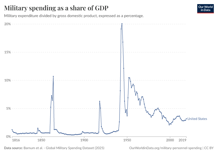 Barnum et al. - Global Military Spending Dataset (2025) – with minor processing by Our World in Data. “Military spending as a share of GDP” [dataset]. Barnum et al., “Global Military Spending Dataset Version 8” [original data]. Retrieved January 13, 2026 from https://archive.ourworldindata.org/20251209-133038/grapher/military-spending-as-a-share-of-gdp-gmsd.html (archived on December 9, 2025).