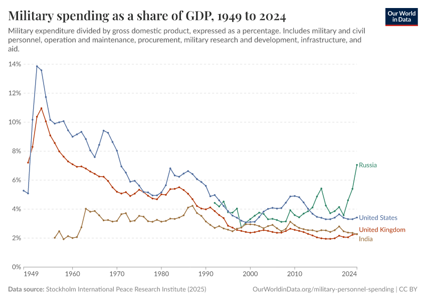 Stockholm International Peace Research Institute (2025) – with minor processing by Our World in Data. “Military spending as a share of GDP” [dataset]. Stockholm International Peace Research Institute, “SIPRI Military Expenditure Database” [original data]. Retrieved December 12, 2025 from https://archive.ourworldindata.org/20251209-133038/grapher/military-spending-as-a-share-of-gdp-sipri.html (archived on December 9, 2025).