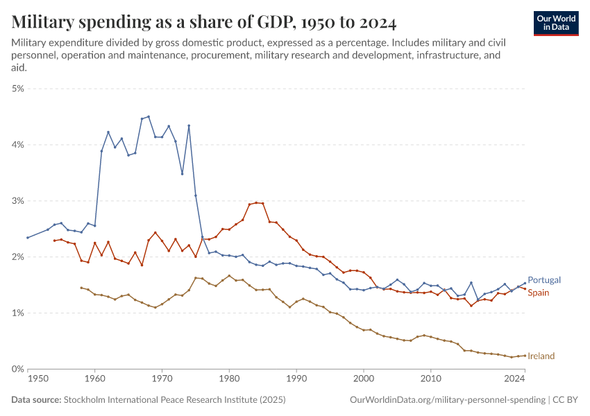 Stockholm International Peace Research Institute (2025) – with minor processing by Our World in Data. “Military spending as a share of GDP” [dataset]. Stockholm International Peace Research Institute, “SIPRI Military Expenditure Database” [original data]. Retrieved January 25, 2026 from https://archive.ourworldindata.org/20260105-133053/grapher/military-spending-as-a-share-of-gdp-sipri.html (archived on January 5, 2026).