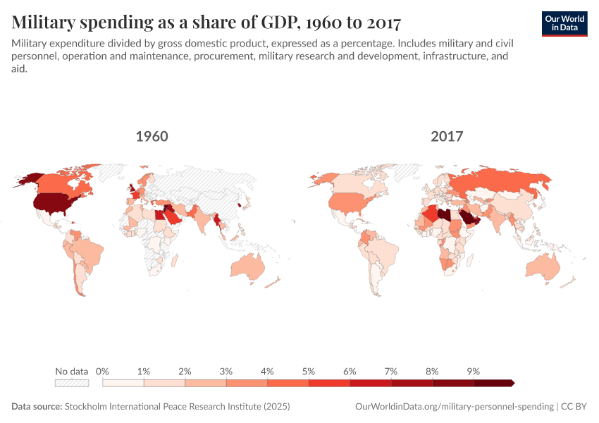 “Data Page: Military spending as a share of GDP”, part of the following publication: Bastian Herre and Pablo Arriagada (2013) - “Military Personnel and Spending”. Data adapted from Stockholm International Peace Research Institute. Retrieved from https://archive.ourworldindata.org/20260105-133053/grapher/military-spending-as-a-share-of-gdp-sipri.html [online resource] (archived on January 5, 2026).How to cite this data