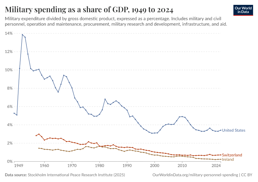 Stockholm International Peace Research Institute (2025) – with minor processing by Our World in Data. “Military spending as a share of GDP” [dataset]. Stockholm International Peace Research Institute, “SIPRI Military Expenditure Database” [original data]. Retrieved April 23, 2026 from https://archive.ourworldindata.org/20260417-112857/grapher/military-spending-as-a-share-of-gdp-sipri.html (archived on April 17, 2026).