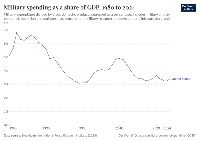 “Data Page: Military spending as a share of GDP”, part of the following publication: Bastian Herre and Pablo Arriagada (2013) - “Military Personnel and Spending”. Data adapted from Stockholm International Peace Research Institute. Retrieved from https://archive.ourworldindata.org/20260105-133053/grapher/military-spending-as-a-share-of-gdp-sipri.html [online resource] (archived on January 5, 2026).How to cite this data