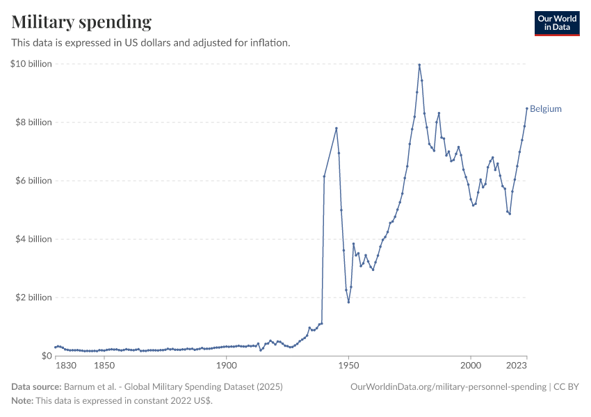 Barnum et al. - Global Military Spending Dataset (2025) – with minor processing by Our World in Data. “Military spending” [dataset]. Barnum et al., “Global Military Spending Dataset Version 8” [original data]. Retrieved December 30, 2025 from https://archive.ourworldindata.org/20251209-133038/grapher/military-spending-gmsd.html (archived on December 9, 2025).