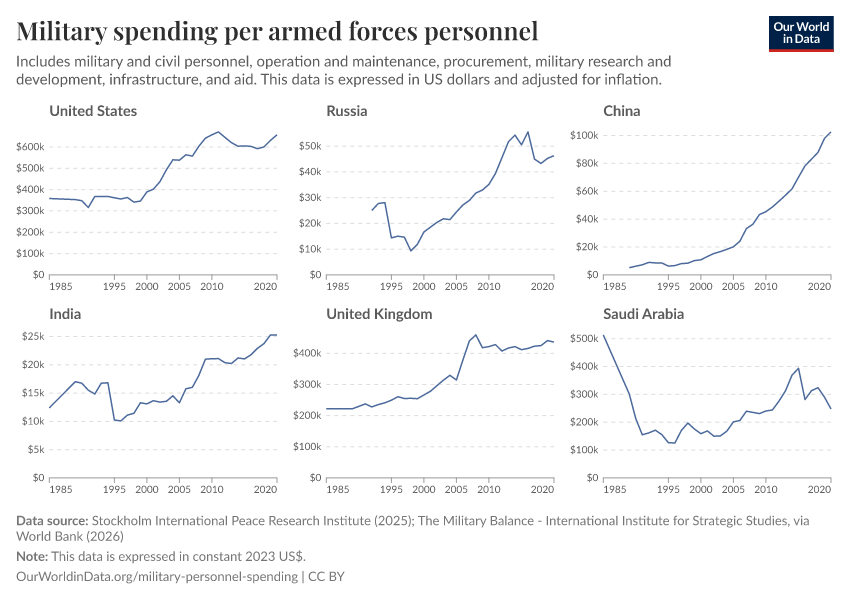 Stockholm International Peace Research Institute (2025); The Military Balance - International Institute for Strategic Studies, via World Bank (2026) – with major processing by Our World in Data. “Military spending per armed forces personnel” [dataset]. Stockholm International Peace Research Institute, “SIPRI Military Expenditure Database”; The Military Balance - International Institute for Strategic Studies, via World Bank, “World Development Indicators 125” [original data]. Retrieved April 4, 2026 from https://archive.ourworldindata.org/20260325-171315/grapher/military-spending-per-armed-forces-personnel.html (archived on March 25, 2026).