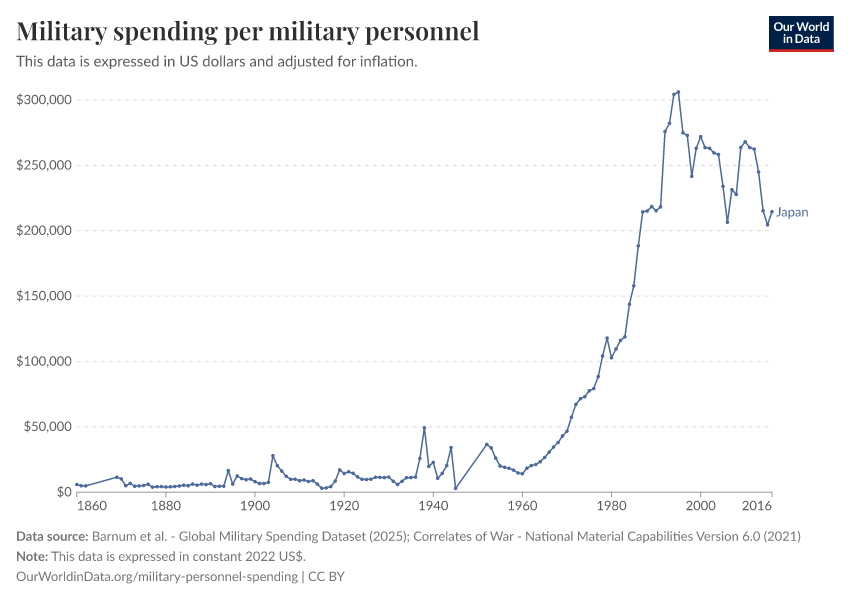 Barnum et al. - Global Military Spending Dataset (2025); Correlates of War - National Material Capabilities Version 6.0 (2021) – with major processing by Our World in Data. “Military spending per military personnel” [dataset]. Barnum et al., “Global Military Spending Dataset Version 8”; Correlates of War, “National Material Capabilities Version 6.0” [original data]. Retrieved March 16, 2026 from https://archive.ourworldindata.org/20260304-094028/grapher/military-spending-per-military-personnel.html (archived on March 4, 2026).