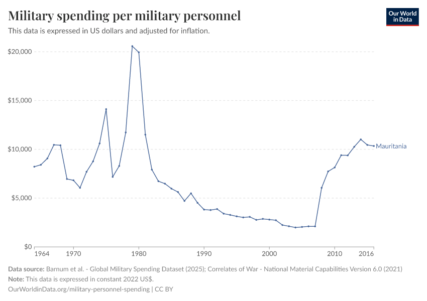Barnum et al. - Global Military Spending Dataset (2025); Correlates of War - National Material Capabilities Version 6.0 (2021) – with major processing by Our World in Data. “Military spending per military personnel” [dataset]. Barnum et al., “Global Military Spending Dataset Version 8”; Correlates of War, “National Material Capabilities Version 6.0” [original data]. Retrieved November 14, 2025 from https://archive.ourworldindata.org/20250909-093708/grapher/military-spending-per-military-personnel.html (archived on September 9, 2025).