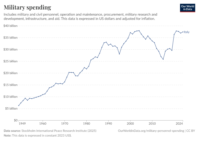 “Data Page: Military spending”, part of the following publication: Bastian Herre and Pablo Arriagada (2013) - “Military Personnel and Spending”. Data adapted from Stockholm International Peace Research Institute. Retrieved from https://archive.ourworldindata.org/20251209-133038/grapher/military-spending-sipri.html [online resource] (archived on December 9, 2025).How to cite this data