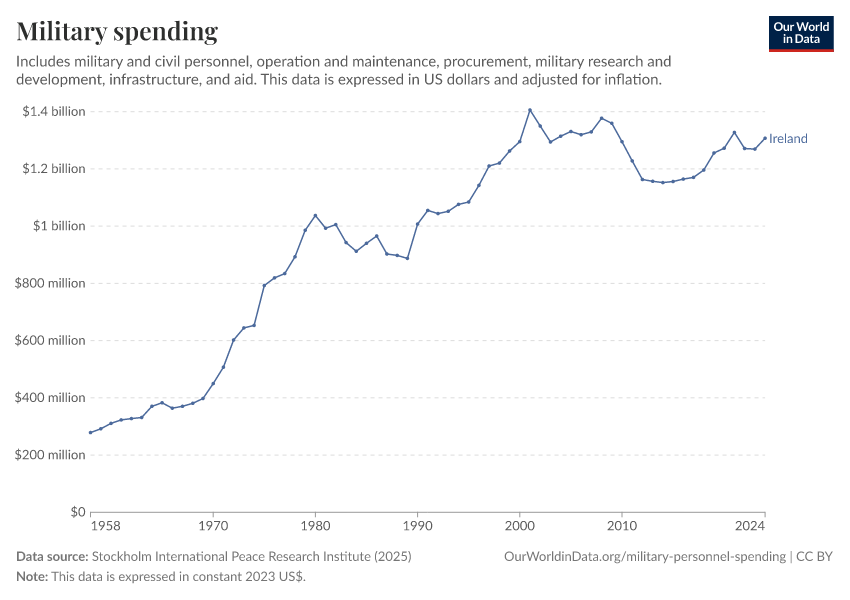 Stockholm International Peace Research Institute (2025) – with minor processing by Our World in Data. “Military spending” [dataset]. Stockholm International Peace Research Institute, “SIPRI Military Expenditure Database” [original data]. Retrieved January 25, 2026 from https://archive.ourworldindata.org/20260123-143741/grapher/military-spending-sipri.html (archived on January 23, 2026).
