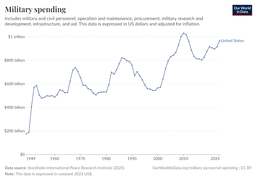 Stockholm International Peace Research Institute (2025) – with minor processing by Our World in Data. “Military spending” [dataset]. Stockholm International Peace Research Institute, “SIPRI Military Expenditure Database” [original data]. Retrieved December 7, 2025 from https://archive.ourworldindata.org/20250909-093708/grapher/military-spending-sipri.html (archived on September 9, 2025).