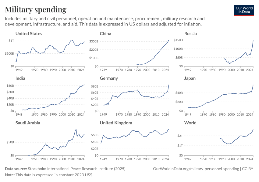 Stockholm International Peace Research Institute (2025) – with minor processing by Our World in Data. “Military spending” [dataset]. Stockholm International Peace Research Institute, “SIPRI Military Expenditure Database” [original data]. Retrieved April 1, 2026 from https://archive.ourworldindata.org/20260325-171315/grapher/military-spending-sipri.html (archived on March 25, 2026).Download