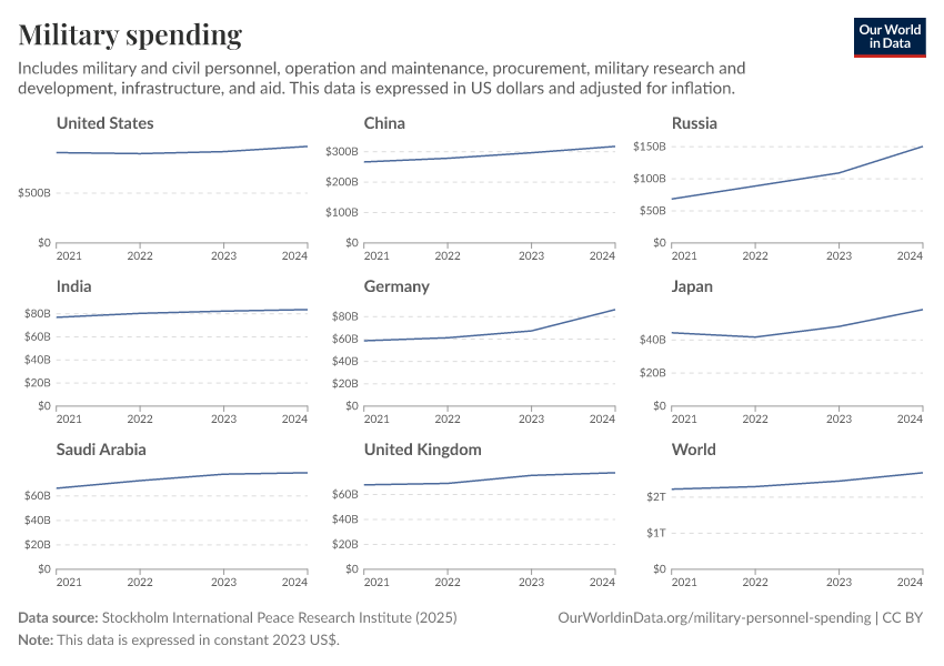Stockholm International Peace Research Institute (2025) – with minor processing by Our World in Data. “Military spending” [dataset]. Stockholm International Peace Research Institute, “SIPRI Military Expenditure Database” [original data]. Retrieved April 23, 2026 from https://archive.ourworldindata.org/20260417-112857/grapher/military-spending-sipri.html (archived on April 17, 2026).Download