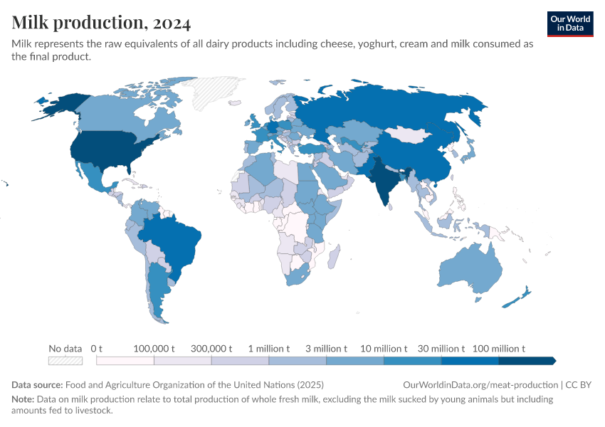 Food and Agriculture Organization of the United Nations (2025) – with major processing by Our World in Data. “Milk production – UN FAO” [dataset]. Food and Agriculture Organization of the United Nations, “Production: Crops and livestock products” [original data]. Retrieved March 17, 2026 from https://archive.ourworldindata.org/20260304-094028/grapher/milk-production-tonnes.html (archived on March 4, 2026).