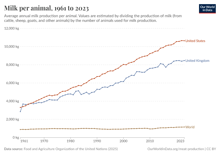 Food and Agriculture Organization of the United Nations (2025) – with major processing by Our World in Data. “Milk per animal – FAO” [dataset]. Food and Agriculture Organization of the United Nations, “Production: Crops and livestock products” [original data]. Retrieved November 16, 2025 from https://archive.ourworldindata.org/20251014-163147/grapher/milk-yields-per-animal.html (archived on October 14, 2025).
