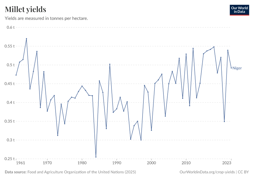 Food and Agriculture Organization of the United Nations (2025) – with major processing by Our World in Data. “Millet yields – UN FAO” [dataset]. Food and Agriculture Organization of the United Nations, “Production: Crops and livestock products” [original data]. Retrieved December 5, 2025 from https://archive.ourworldindata.org/20251014-161652/grapher/millet-yield.html (archived on October 14, 2025).