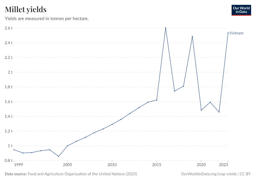 Food and Agriculture Organization of the United Nations (2025) – with major processing by Our World in Data. “Millet yields – UN FAO” [dataset]. Food and Agriculture Organization of the United Nations, “Production: Crops and livestock products” [original data]. Retrieved December 5, 2025 from https://archive.ourworldindata.org/20251014-161652/grapher/millet-yield.html (archived on October 14, 2025).