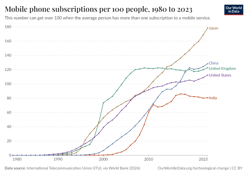 “Data Page: Mobile phone subscriptions per 100 people”. Our World in Data (2026). Data adapted from International Telecommunication Union (ITU), via World Bank. Retrieved from https://archive.ourworldindata.org/20260304-094028/grapher/mobile-cellular-subscriptions-per-100-people.html [online resource] (archived on March 4, 2026).