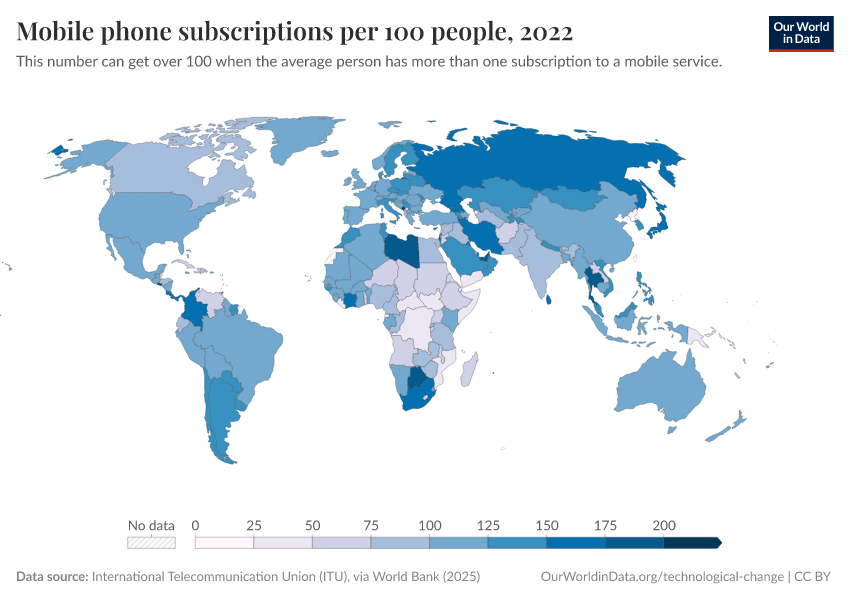 “Data Page: Mobile phone subscriptions per 100 people”. Our World in Data (2025). Data adapted from International Telecommunication Union (ITU), via World Bank. Retrieved from https://archive.ourworldindata.org/20251220-152415/grapher/mobile-cellular-subscriptions-per-100-people.html [online resource] (archived on December 20, 2025).How to cite this data