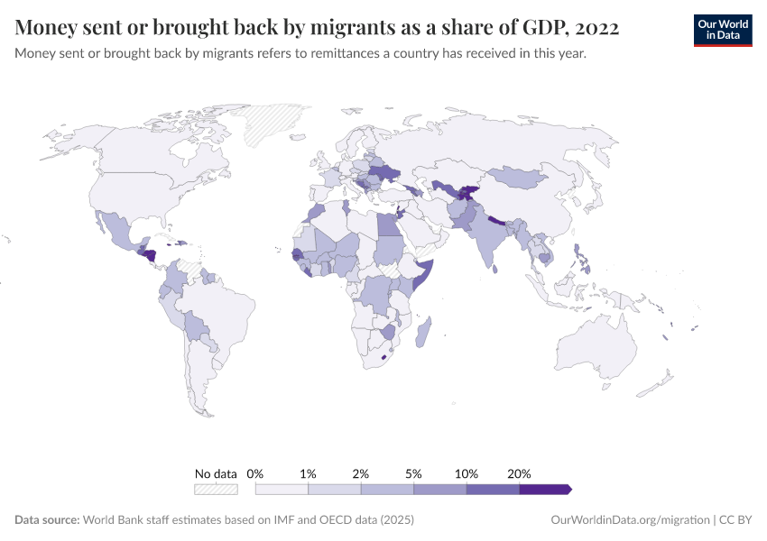 “Data Page: Money sent or brought back by migrants as a share of GDP”. Our World in Data (2025). Data adapted from World Bank staff estimates based on IMF and OECD data. Retrieved from https://archive.ourworldindata.org/20250916-103535/grapher/money-sent-or-brought-back-by-migrants-as-a-share-of-gdp.html [online resource] (archived on September 16, 2025).How to cite this data