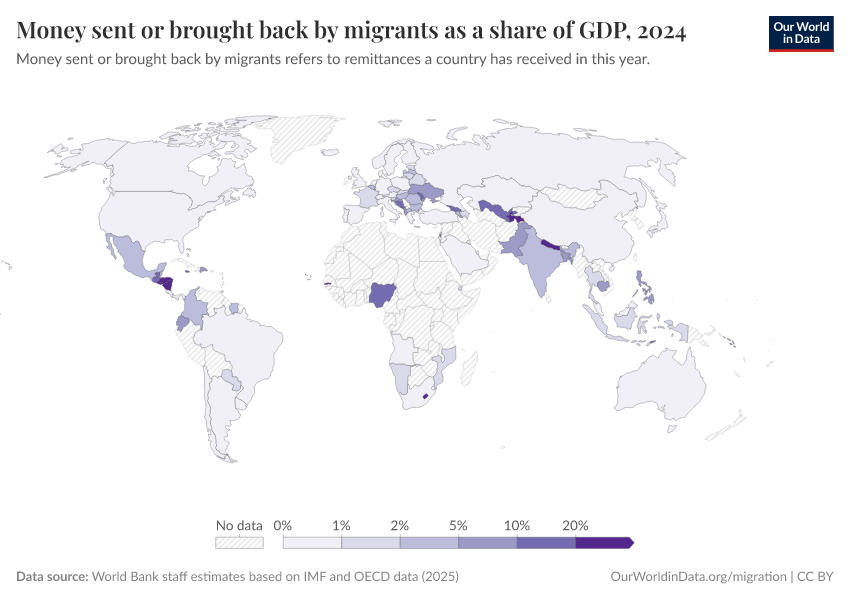 “Data Page: Money sent or brought back by migrants as a share of GDP”. Our World in Data (2025). Data adapted from World Bank staff estimates based on IMF and OECD data. Retrieved from https://archive.ourworldindata.org/20251220-152415/grapher/money-sent-or-brought-back-by-migrants-as-a-share-of-gdp.html [online resource] (archived on December 20, 2025).
