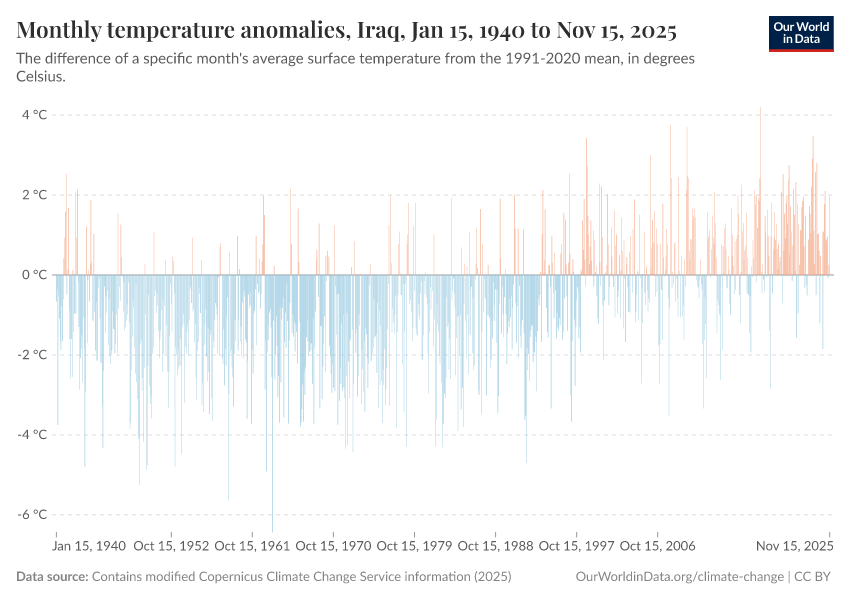 Contains modified Copernicus Climate Change Service information (2025) – with major processing by Our World in Data. “Monthly temperature anomalies” [dataset]. Contains modified Copernicus Climate Change Service information, “ERA5 monthly averaged data on single levels from 1940 to present 2” [original data]. Retrieved December 18, 2025 from https://archive.ourworldindata.org/20251210-141710/grapher/monthly-temperature-anomalies.html (archived on December 10, 2025).