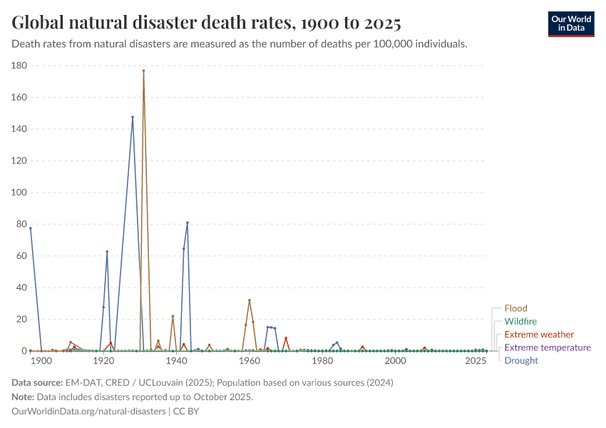 EM-DAT, CRED / UCLouvain (2025); Population based on various sources (2024) – with major processing by Our World in Data. “Global natural disaster death rates – EM-DAT” [dataset]. EM-DAT, “The International Disasters Database”; Various sources, “Population” [original data]. Retrieved January 14, 2026 from https://archive.ourworldindata.org/20260112-111535/grapher/natural-disaster-death-rates.html (archived on January 12, 2026).