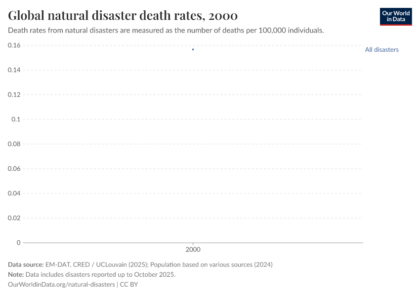 EM-DAT, CRED / UCLouvain (2025); Population based on various sources (2024) – with major processing by Our World in Data. “Global natural disaster death rates – EM-DAT” [dataset]. EM-DAT, “The International Disasters Database”; Various sources, “Population” [original data]. Retrieved January 13, 2026 from https://archive.ourworldindata.org/20260112-111535/grapher/natural-disaster-death-rates.html (archived on January 12, 2026).