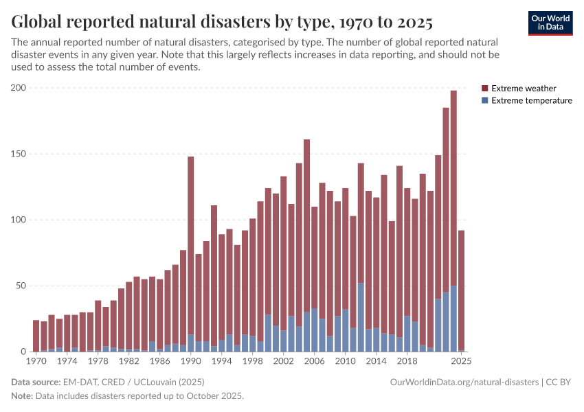 EM-DAT, CRED / UCLouvain (2025) – with major processing by Our World in Data. “Global reported natural disasters by type – EM-DAT” [dataset]. EM-DAT, CRED / UCLouvain, “Natural disasters” [original data]. Retrieved December 5, 2025 from https://archive.ourworldindata.org/20251106-143232/grapher/natural-disasters-by-type.html (archived on November 6, 2025).