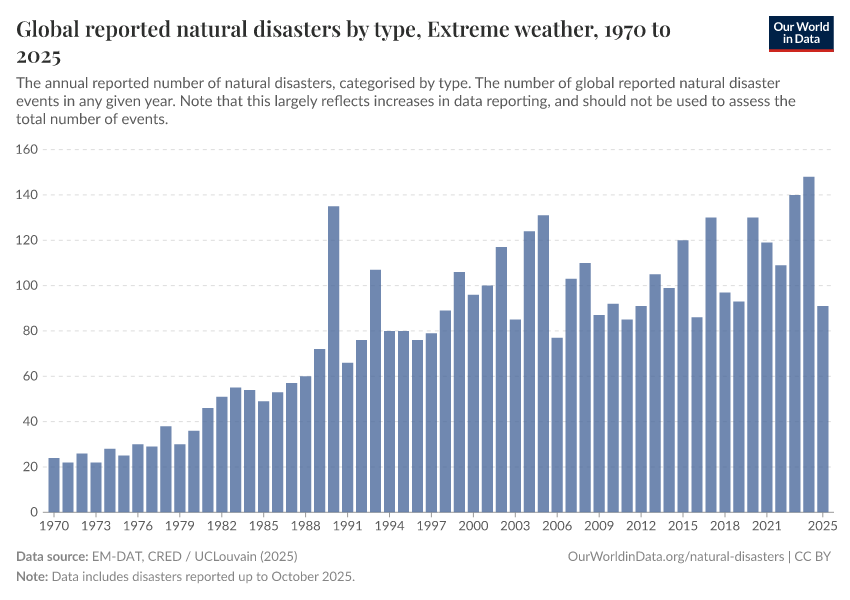 EM-DAT, CRED / UCLouvain (2025) – with major processing by Our World in Data. “Global reported natural disasters by type – EM-DAT” [dataset]. EM-DAT, CRED / UCLouvain, “Natural disasters” [original data]. Retrieved December 6, 2025 from https://archive.ourworldindata.org/20251106-143232/grapher/natural-disasters-by-type.html (archived on November 6, 2025).
