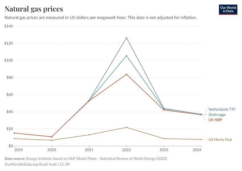 “Data Page: Natural gas prices”, part of the following publication: Hannah Ritchie, Pablo Rosado, and Max Roser (2023) - “Energy”. Data adapted from Energy Institute. Retrieved from https://archive.ourworldindata.org/20250909-093708/grapher/natural-gas-prices.html [online resource] (archived on September 9, 2025).