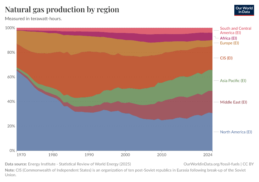 Energy Institute - Statistical Review of World Energy (2025) – with major processing by Our World in Data. “Gas production” [dataset]. Energy Institute, “Statistical Review of World Energy” [original data]. Retrieved December 21, 2025 from https://archive.ourworldindata.org/20250909-093708/grapher/natural-gas-production-by-region-terawatt-hours-twh.html (archived on September 9, 2025).