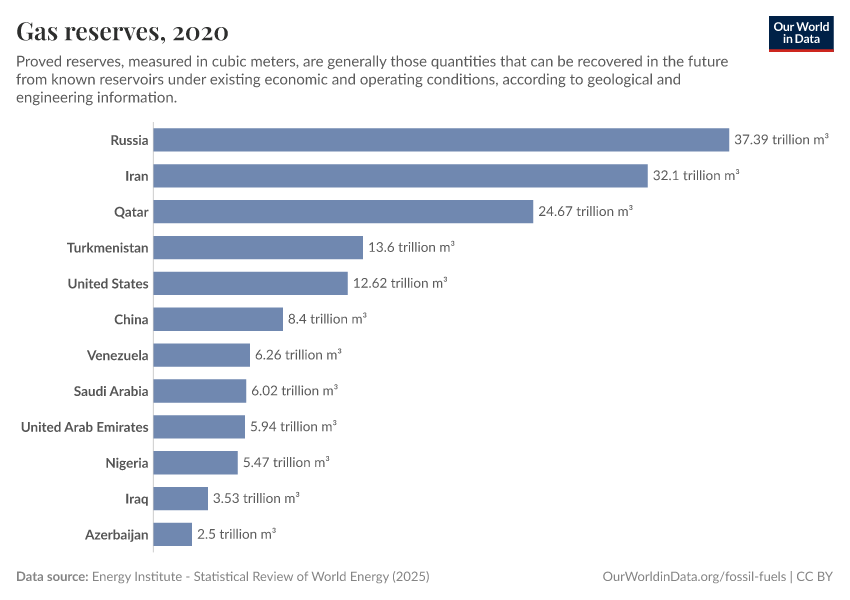 Energy Institute - Statistical Review of World Energy (2025) – with major processing by Our World in Data. “Gas proved reserves” [dataset]. Energy Institute, “Statistical Review of World Energy” [original data]. Retrieved December 18, 2025 from https://archive.ourworldindata.org/20250909-093708/grapher/natural-gas-proved-reserves.html (archived on September 9, 2025).