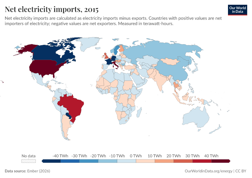 “Data Page: Net electricity imports”, part of the following publication: Hannah Ritchie, Pablo Rosado, and Max Roser (2023) - “Energy”. Data adapted from Ember. Retrieved from https://archive.ourworldindata.org/20260304-094028/grapher/net-electricity-imports.html [online resource] (archived on March 4, 2026).How to cite this data
