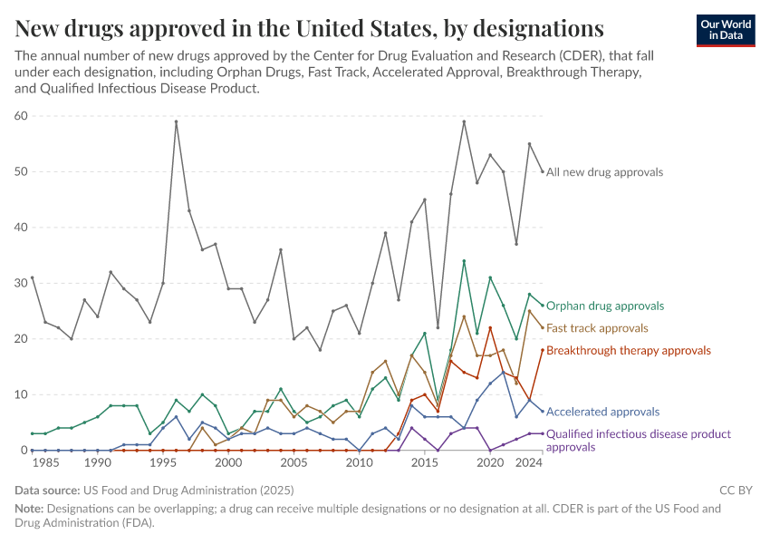 US Food and Drug Administration (2025) – with major processing by Our World in Data. “New drugs approved in the United States, by designations” [dataset]. US Food and Drug Administration, “CDER New Molecular Entity (NME) Drug and New Biologic Approvals” [original data]. Retrieved December 5, 2025 from https://archive.ourworldindata.org/20250918-115831/grapher/new-drugs-approved-in-the-united-states-by-designations.html (archived on September 18, 2025).