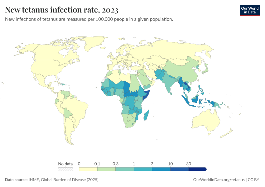 IHME, Global Burden of Disease (2025) – with major processing by Our World in Data. “New tetanus infection rate” [dataset]. IHME, Global Burden of Disease, “Global Burden of Disease - Prevalence and Incidence” [original data]. Retrieved March 3, 2026 from https://archive.ourworldindata.org/20260212-172132/grapher/new-infections-with-tetanus.html (archived on February 12, 2026).
