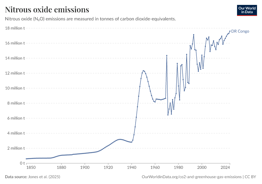 Jones et al. (2025) – with major processing by Our World in Data. “Annual nitrous oxide emissions including land use” [dataset]. Jones et al., “National contributions to climate change 2025.1” [original data]. Retrieved February 16, 2026 from https://archive.ourworldindata.org/20260119-070102/grapher/nitrous-oxide-emissions.html (archived on January 19, 2026).