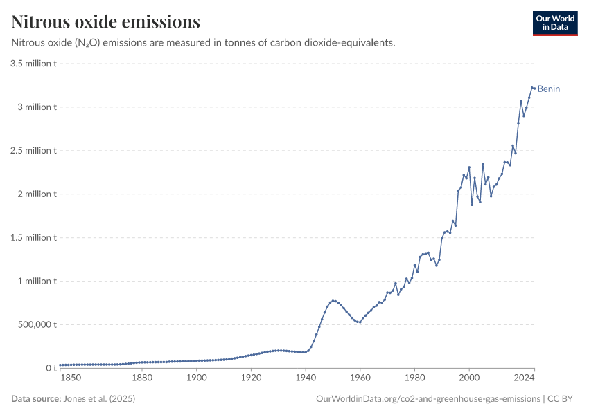 Jones et al. (2025) – with major processing by Our World in Data. “Annual nitrous oxide emissions including land use” [dataset]. Jones et al., “National contributions to climate change 2025.1” [original data]. Retrieved December 11, 2025 from https://archive.ourworldindata.org/20251204-133820/grapher/nitrous-oxide-emissions.html (archived on December 4, 2025).