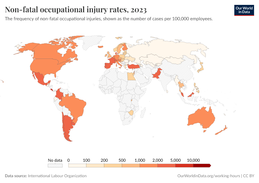 “Data Page: Non-fatal occupational injury rates”. Our World in Data (2025). Data adapted from International Labour Organization. Retrieved from https://archive.ourworldindata.org/20251120-211038/grapher/non-fatal-occupational-injuries-per-100000.html [online resource] (archived on November 20, 2025).How to cite this data