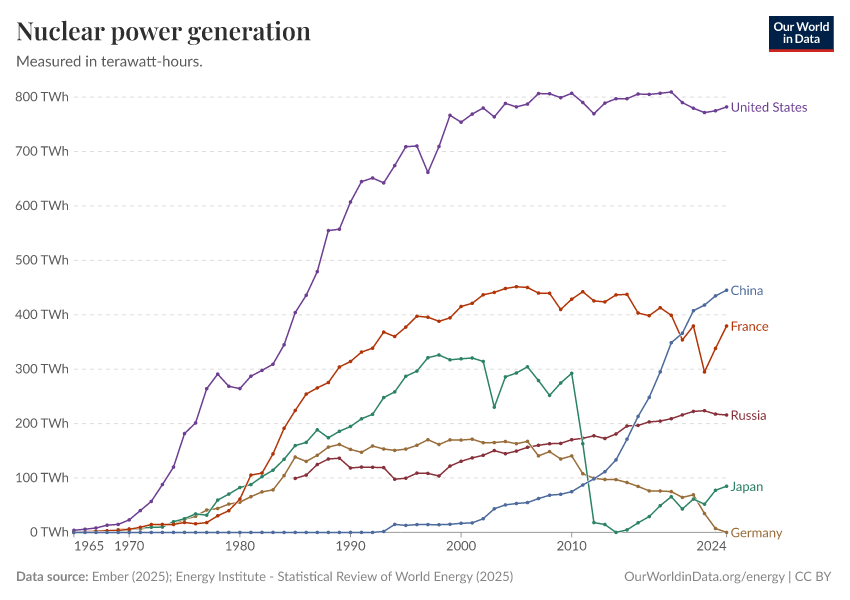 “Data Page: Electricity generation from nuclear”, part of the following publication: Hannah Ritchie, Pablo Rosado, and Max Roser (2023) - “Energy”. Data adapted from Ember, Energy Institute. Retrieved from https://archive.ourworldindata.org/20250909-093708/grapher/nuclear-energy-generation.html [online resource] (archived on September 9, 2025).How to cite this data