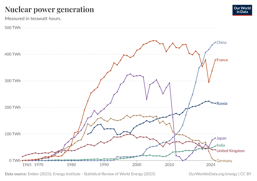 “Data Page: Electricity generation from nuclear”, part of the following publication: Hannah Ritchie, Pablo Rosado, and Max Roser (2023) - “Energy”. Data adapted from Ember, Energy Institute. Retrieved from https://archive.ourworldindata.org/20250909-093708/grapher/nuclear-energy-generation.html [online resource] (archived on September 9, 2025).How to cite this data