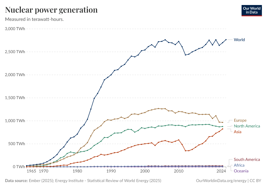 “Data Page: Electricity generation from nuclear”, part of the following publication: Hannah Ritchie, Pablo Rosado, and Max Roser (2023) - “Energy”. Data adapted from Ember, Energy Institute. Retrieved from https://archive.ourworldindata.org/20250909-093708/grapher/nuclear-energy-generation.html [online resource] (archived on September 9, 2025).How to cite this data